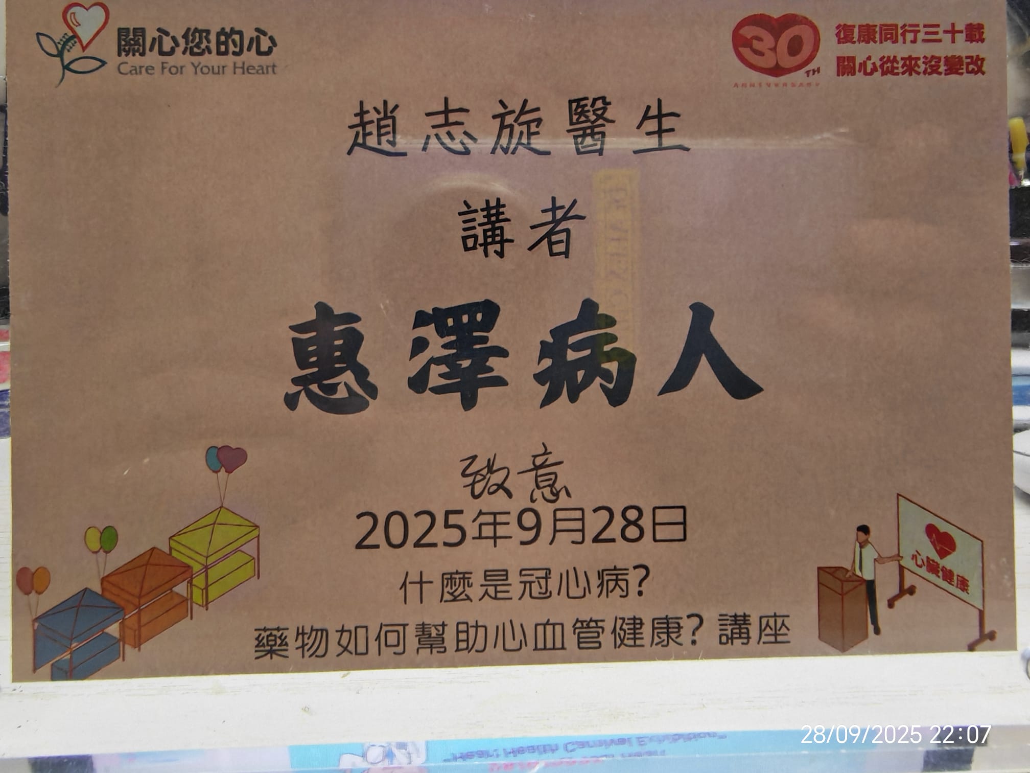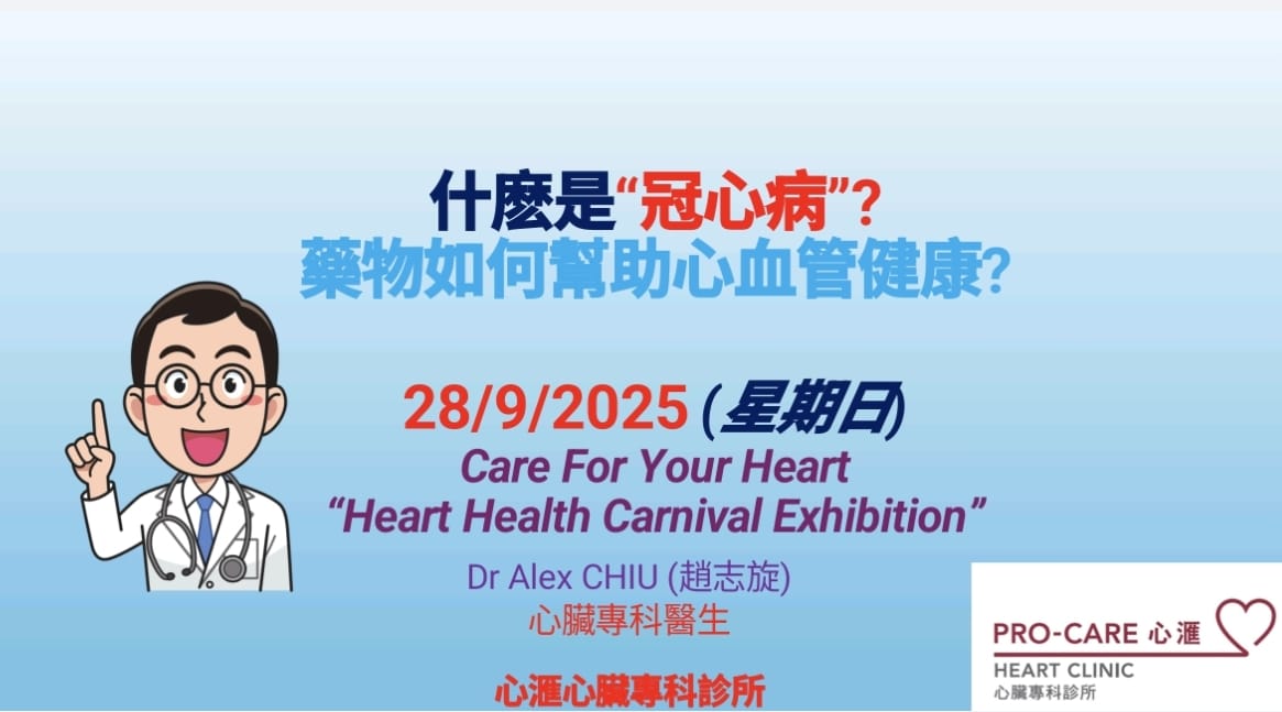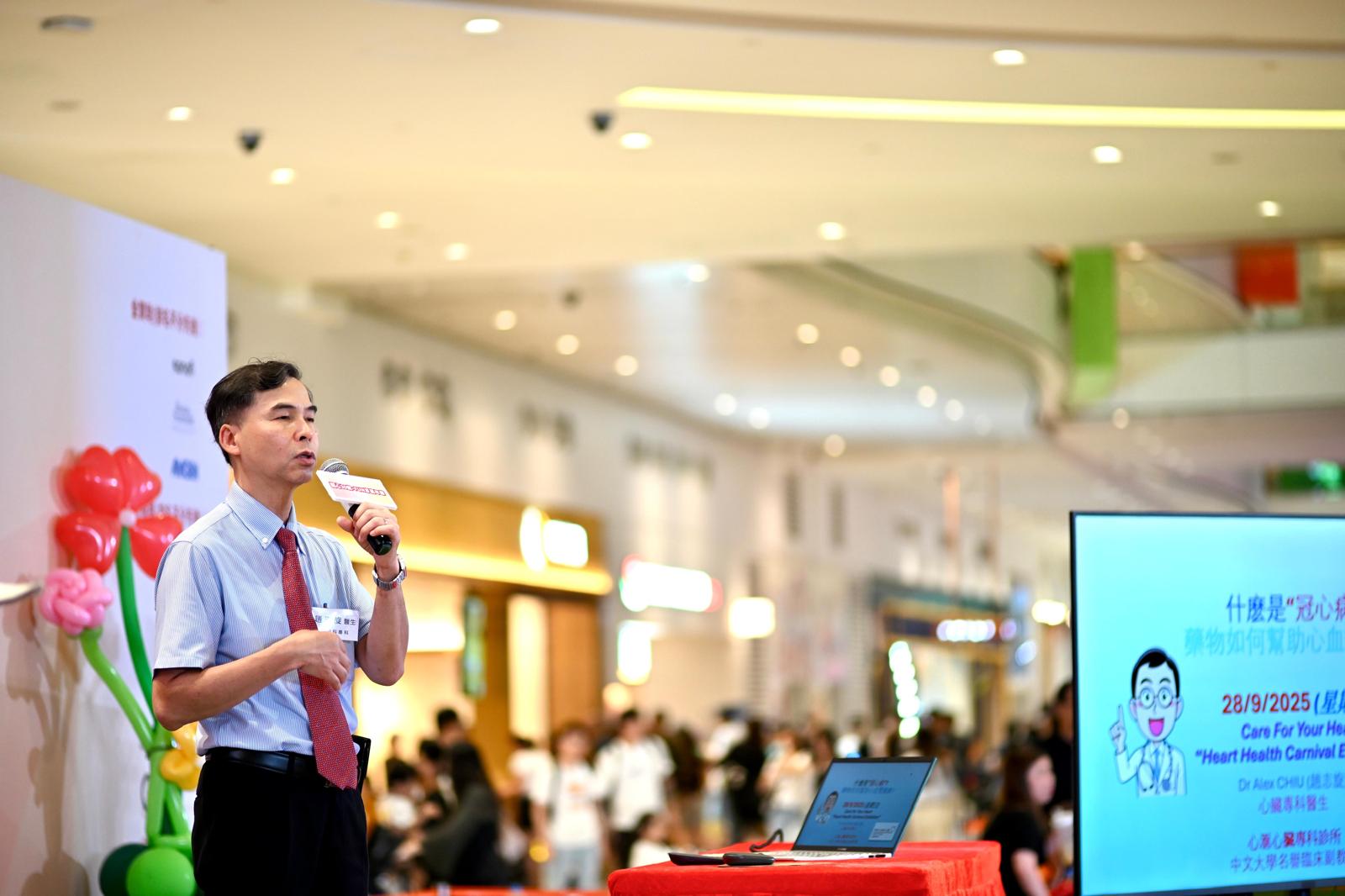 9 月 28 日,心臟科專科趙志旋醫生受邀到愉景新城舉行的關心您的心-心臟健康嘉年華展覽,為大家帶來了一場健康講座,主題是「什麼是冠心病?藥物如何幫助心血管健康?」。